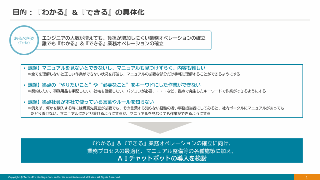 テクノプロ・ホールディングス ビジネスプロセス改革部の担当者は「拠点から見たら、本来どの部署が発行しているマニュアルかどうかではなく、やりたい又はやらなくてはならない業務軸でマニュアルを探せるほうが望ましいはず」と認識。縦割りで整理している情報から業務という横軸で必要な情報を集めてわかりやすく説明してくれるツールとして事務業務AIチャットボットの導入を決定しました。