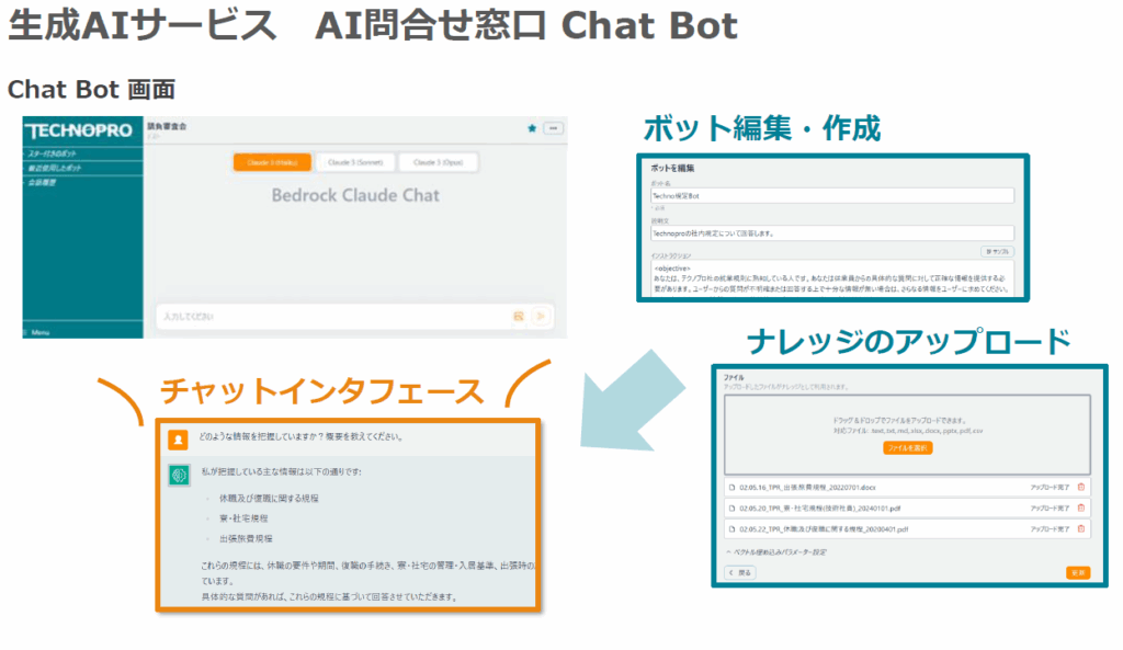 テクノプロ・エンジニアリング社は、AWS環境を採用した理由は、社内の規程・マニュアル・帳票データなどを安全かつ柔軟に連携させるためです。これにより、AIが社内文書を参照しながら、正確かつ実務に即した回答を生成できるようになりました。