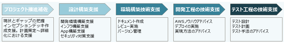 クラウド環境の設計や構築、アプリケーションの開発、テスト・移行、そして運用・サポートまで、全工程を支援しています。