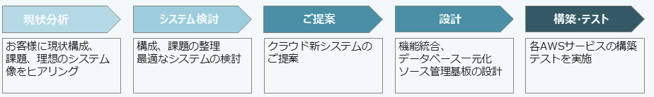 システムのクラウド化を進めるにあたり、弊社では、要件定義から運用フェーズまでを一気通貫でサポートするサービス提供が可能です。