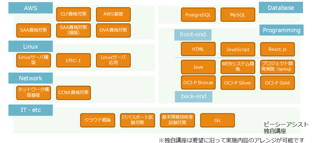 ピーシーアシスト株式会社はAWS公認トレーニングパートナーであるため、AWS公式講座を提供することができます。AWS公認講座に加えて、ピーシーアシスト独自の講座も組み合わせることで、AWS関連だけでなく、Linux、Network、Database、プログラミングなどの周辺スキルを強化します。