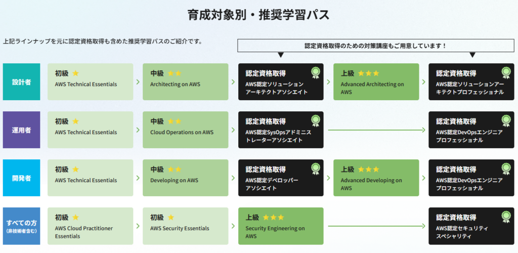 Step 2以降では、より実践的なフレームワーク学習や開発演習、ソリューションアーキテクトアソシエイト資格対策などが含まれます。このパッケージは、資格取得と実務対応力の両面からエンジニアを育成することを目的としています。