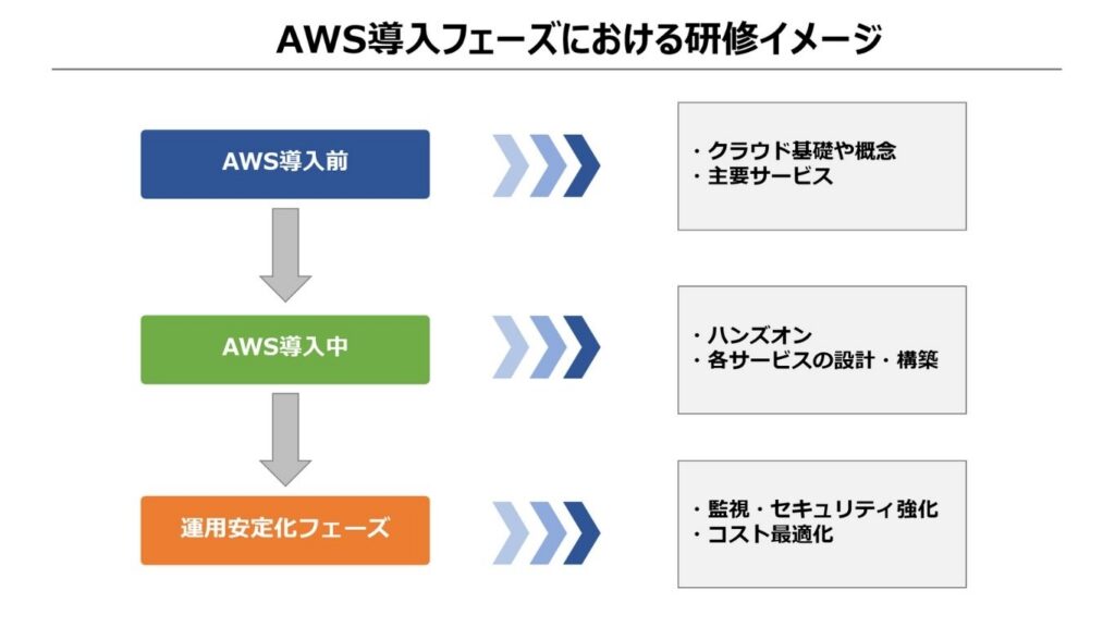 AWSの導入フェーズ別の研修イメージは次の通りです。