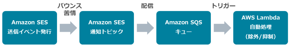 到達率を維持するには、バウンス/苦情を継続的に監視し、無効アドレスを配信対象から除外する運用が不可欠です。SNS通知でイベントを受け取り、自動処理(SQS/Lambda等)につなげる構成が一般的です。