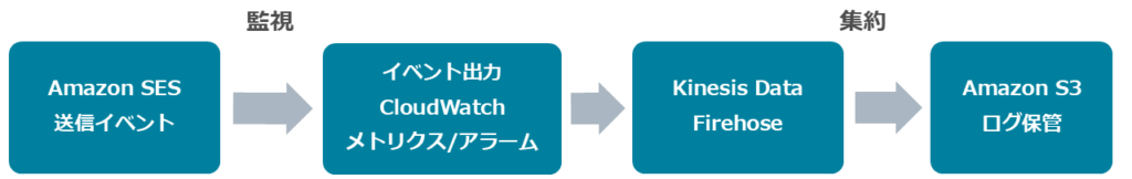 - Amazon SESを中心にCloudWatchやFirehose、S3を組み合わせて送信イベントを可視化・蓄積。