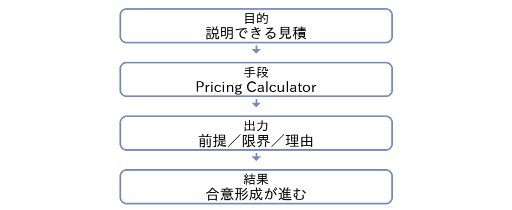 図1の通りAWS Pricing Calculatorの役割は見積は目的で精度と作業量が変わります。たとえば「稟議の予算枠を確保したい」のか、「構成案を比較したい」のかで、必要な前提(ピーク、可用性、運用要件)が異なります。目的が曖昧なまま詳細入力に進むと作り直しになりやすいので、まずは目的を一文で定義し、関係者と共有することが最短ルートです。