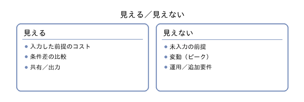 この段階の目的は「当てる」ことではなく、「構成A/Bで何がいくら違うか」を説明できることです。たとえば“冗長化あり/なし”“ピーク想定大/小”“割引前提あり/なし”など、比較軸を固定して差分を見ると、意思決定に必要な会話が進みます。