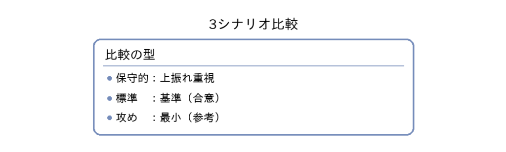 単一の金額提示は、後からの条件変更で説明が破綻しがちです。図3のように「保守的/標準/攻め」など複数シナリオを整理し、条件が変わるとコストがどう上下するかを示します。